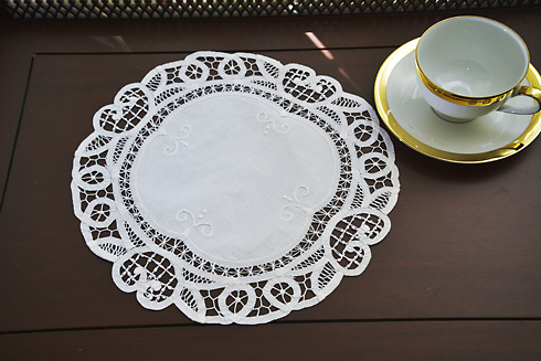 | 10 inches round doilies | US$ 39.00 per dozen | white color | Mother of Pearl color |